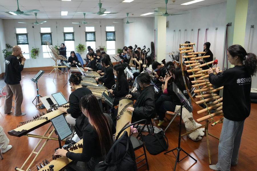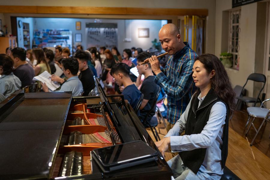 Dong Quang Vinh and his wife Mo Shuangshuang give a lesson to members of an orchestra they found in Hanoi, Vietnam, March 28, 2025. (Xinhua/Zhu Wei)