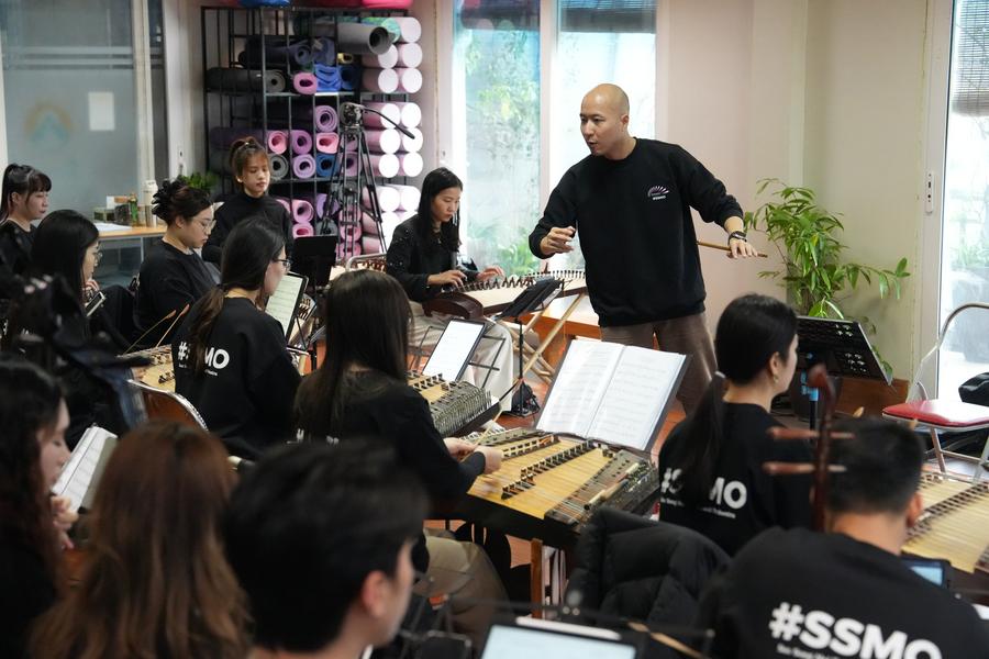 Dong Quang Vinh (R, front) instructs an orchestra he found with his wife Mo Shuangshuang during a rehearsal in Hanoi, Vietnam, March 30, 2025. (Xinhua/Hu Jiali)
