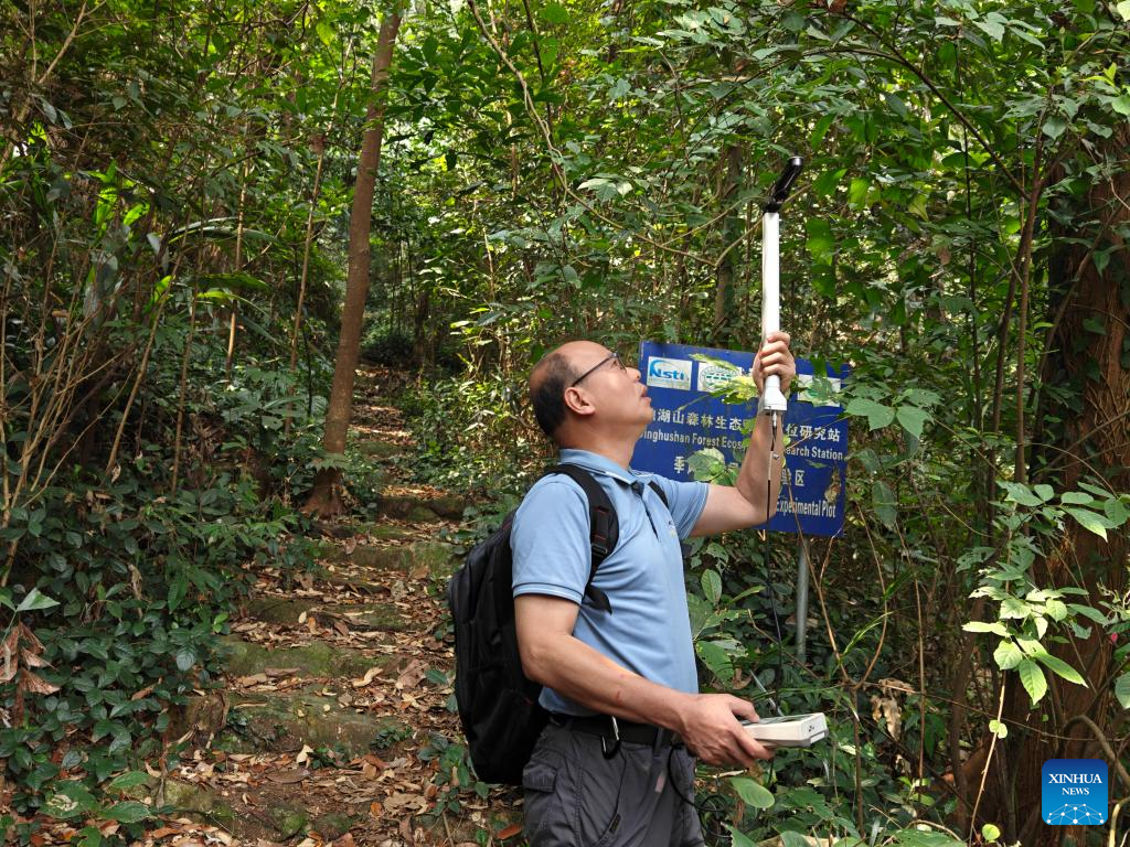 Liu Shizhong, a senior engineer from the South China Botanical Garden (SCBG) of the Chinese Academy of Sciences, conducts observation at Dinghushan National Nature Reserve in Zhaoqing, south China's Guangdong Province, April 9, 2025. (Xinhua/Yu Fei)