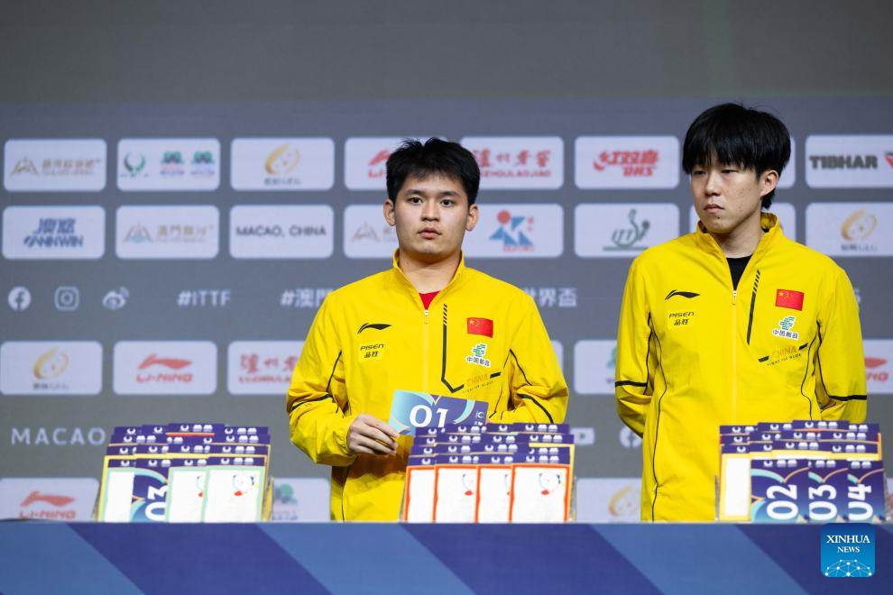 Lin Shidong (L) and Wang Chuqin of China attend the drawing ceremony of the ITTF Men's and Women's World Cup in Macao, China, April 13, 2025. (Xinhua/Cheong Kam Ka)
