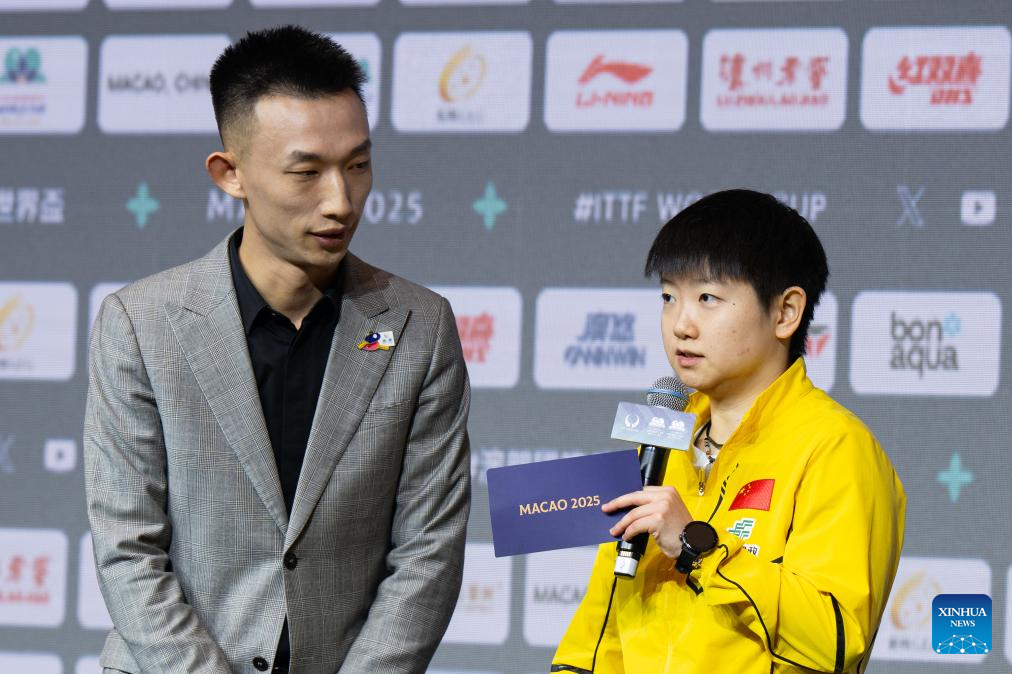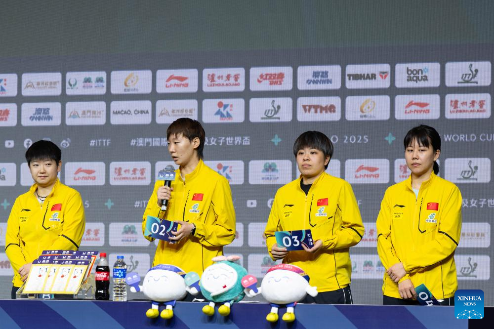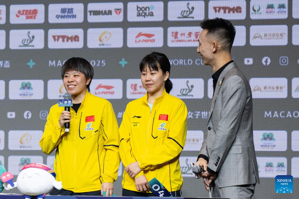 Sun Yingsha (R) of China attends the drawing ceremony of the ITTF Men's and Women's World Cup in Macao, China, April 13, 2025. (Xinhua/Cheong Kam Ka)