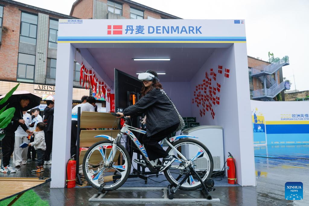 A visitor experiences riding while viewing the scenery of Denmark via VR glasses at the booth of Denmark at 2025 Chengdu Europe Culture Season & European Culture Street in Chengdu, southwest China's Sichuan Province, April 12, 2025. The event, showcasing traditional European art, music and food, was organized by the European Union (EU)'s delegation to China. The year 2025 marks the 50th anniversary of the establishment of diplomatic relations between China and the EU. (Xinhua/Shen Bohan)