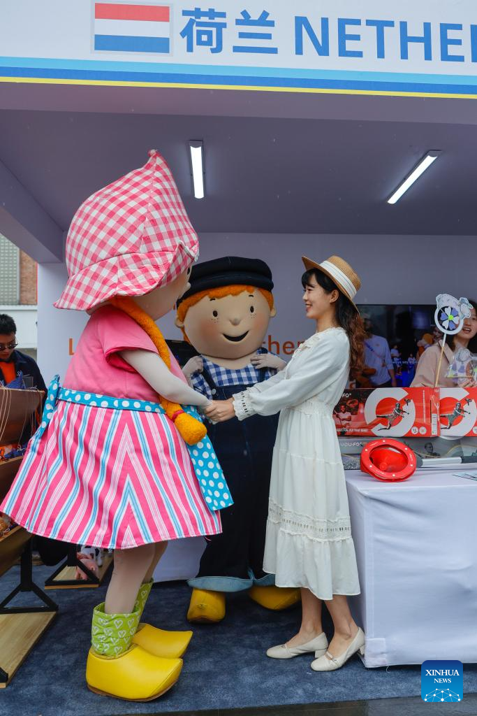 A visitor (R) dances with two actors dressed as cartoon characters at the booth of the Netherlands at 2025 Chengdu Europe Culture Season & European Culture Street in Chengdu, southwest China's Sichuan Province, April 12, 2025. The event, showcasing traditional European art, music and food, was organized by the European Union (EU)'s delegation to China. The year 2025 marks the 50th anniversary of the establishment of diplomatic relations between China and the EU. (Xinhua/Shen Bohan)