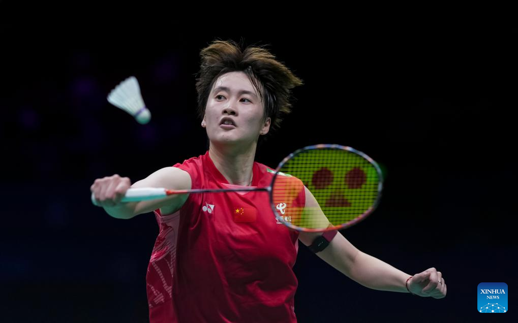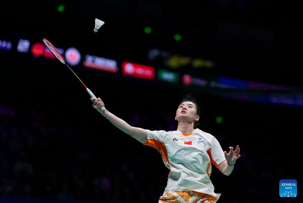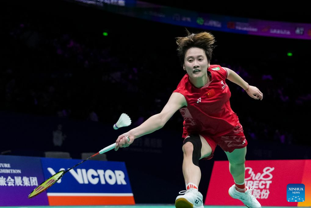 Chen Yufei of China hits a return during the women's singles final against Han Yue of China at Badminton Asia Championships 2025 in Ningbo, east China's Zhejiang Province, April 13, 2025. (Xinhua/Sun Fei)