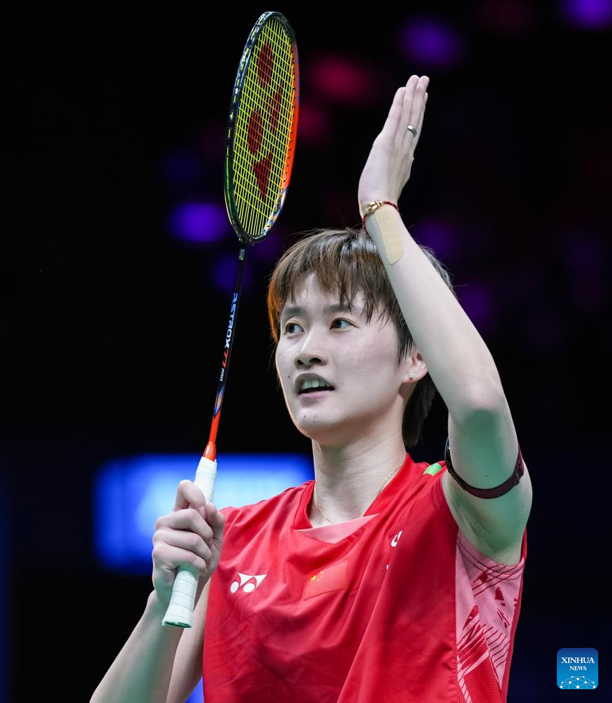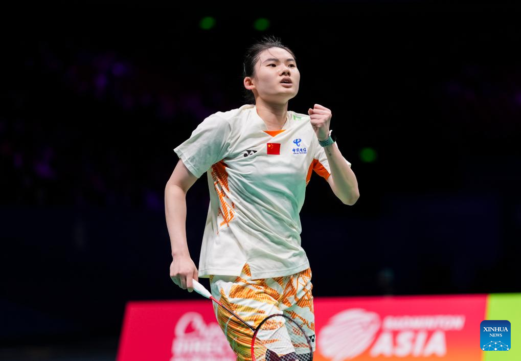 Chen Yufei of China celerates after winning the women's singles final against Han Yue of China at Badminton Asia Championships 2025 in Ningbo, east China's Zhejiang Province, April 13, 2025. (Xinhua/Sun Fei)
