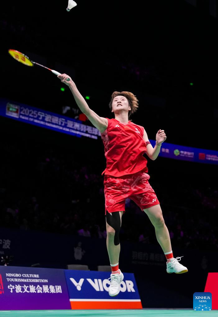 Han Yue of China hits a return during the women's singles final against Chen Yufei of China at Badminton Asia Championships 2025 in Ningbo, east China's Zhejiang Province, April 13, 2025. (Xinhua/Sun Fei)