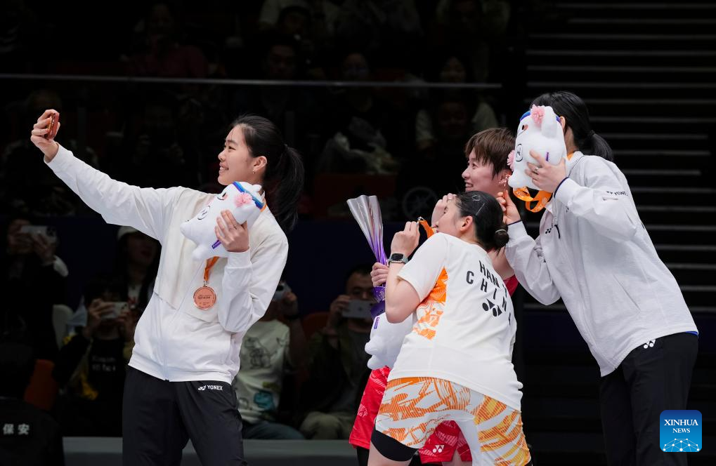Medalists take selfies during the awarding ceremony for the women's singles event at Badminton Asia Championships 2025 in Ningbo, east China's Zhejiang Province, April 13, 2025. (Xinhua/Sun Fei)