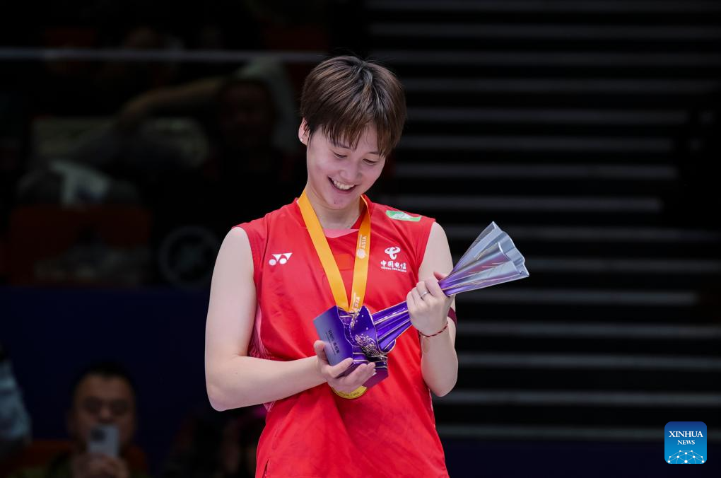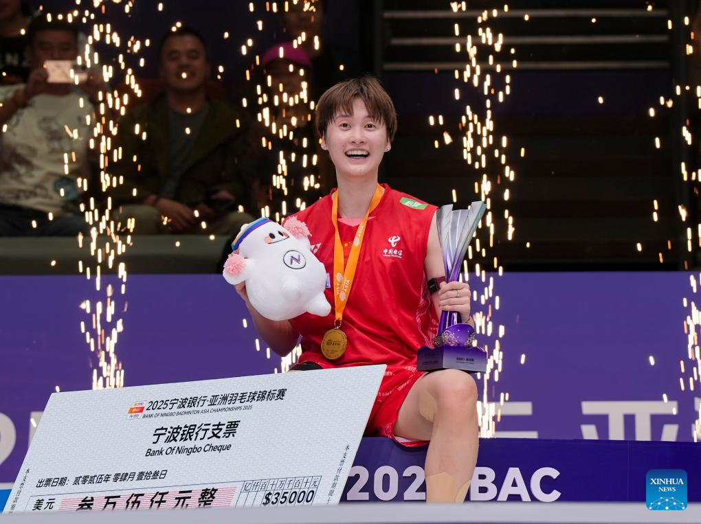 Gold medalist Chen Yufei of China celerates during the awarding ceremony for the women's singles event at Badminton Asia Championships 2025 in Ningbo, east China's Zhejiang Province, April 13, 2025. (Xinhua/Sun Fei)