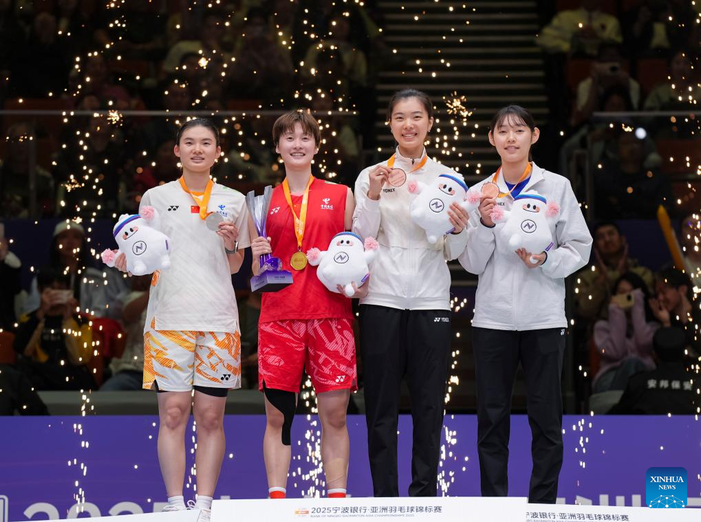 Gold medalist Chen Yufei (2nd L) and silver medalist Han Yue (1st L) of China, bronze medalists Gao Fangjie (2nd R) of China and Sim Yu Jin of South Korea pose for photos during the awarding ceremony for the women's singles event at Badminton Asia Championships 2025 in Ningbo, east China's Zhejiang Province, April 13, 2025. (Xinhua/Sun Fei)
