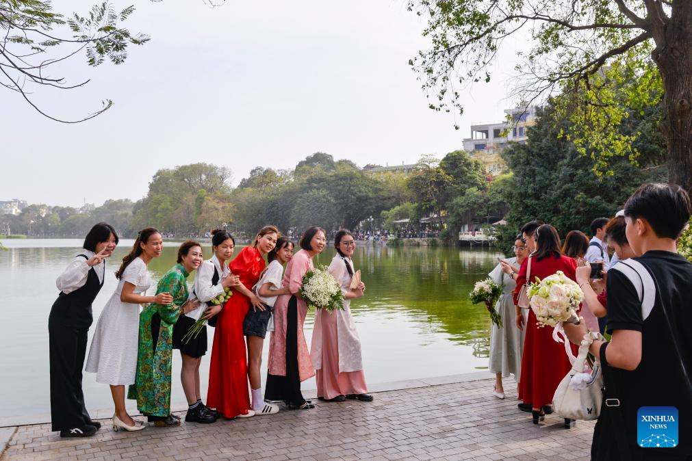 A couple pose for photos on the street in Hanoi, Vietnam, April 9, 2025. The Vietnamese capital city of Hanoi, an ancient city with a history of more than a thousand years, boasts diverse culture and historical sites. (Xinhua/Xu Rui)