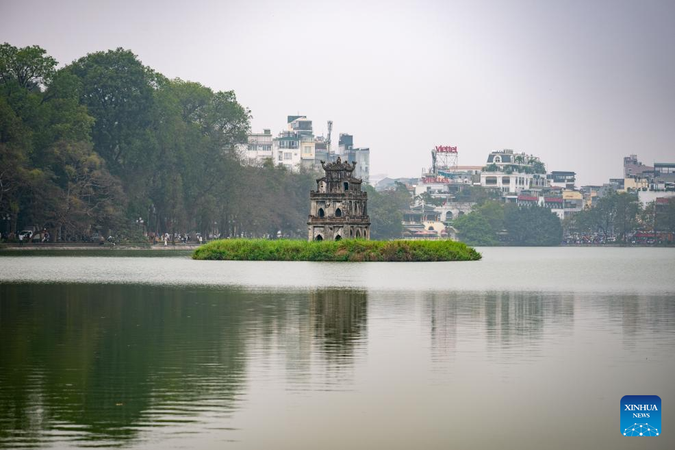 This photo taken on March 26, 2025 shows the Turtle Tower on Hoan Kiem Lake, in Hanoi, Vietnam. The Vietnamese capital city of Hanoi, an ancient city with a history of more than a thousand years, boasts diverse culture and historical sites. (Xinhua/Zhu Wei)
