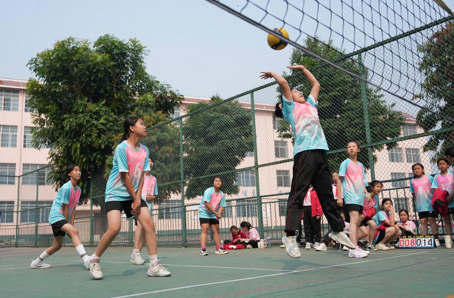 Pupils play volleyball on the playground at a primary school in Ruili, southwest China's Yunnan Province, March 31, 2025. (Xinhua/Chen Xinbo)