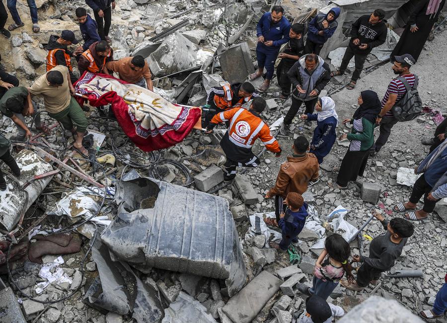 Civil defense workers transfer a victim from the rubble of destroyed buildings after an Israeli airstrike in Jabalia refugee camp, northern Gaza Strip, on April 13, 2025. (Photo by Mahmoud Zaki/Xinhua)