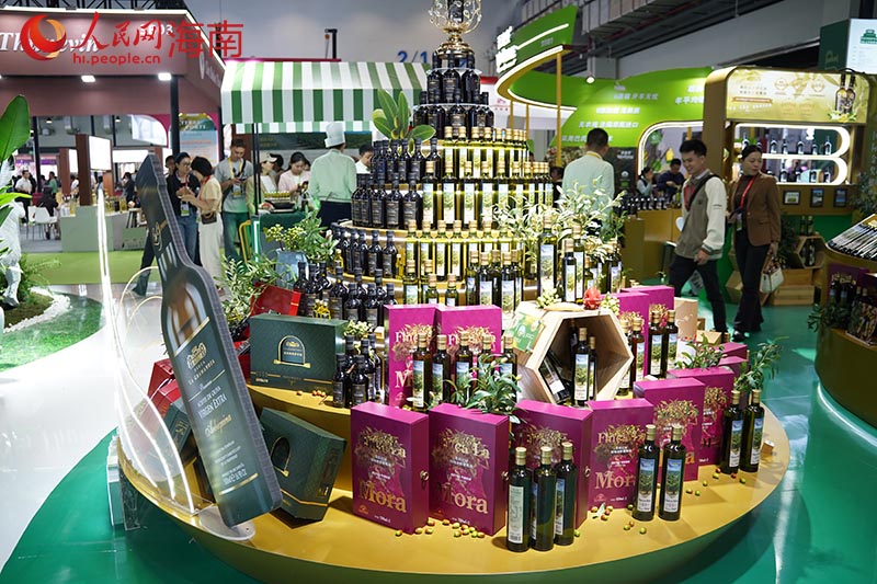 Olive oil products on exhibit at the 5th China International Consumer Products Expo (CICPE), which kicked off in Haikou, south China's Hainan Province, on April 13, 2025. (People's Daily Online/Meng Fansheng)