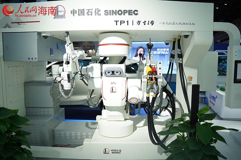 An integrated robotic fuel dispenser showcased at the 5th China International Consumer Products Expo (CICPE), which kicked off in Haikou, south China's Hainan Province, on April 13, 2025. (People's Daily Online/Meng Fansheng)