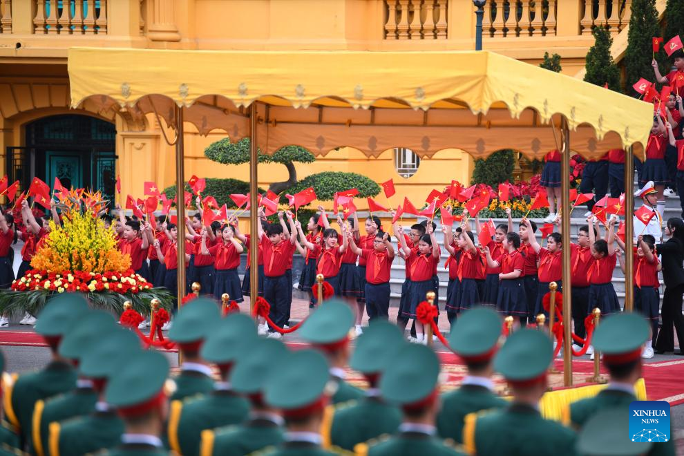 Xi Jinping, general secretary of the Communist Party of China Central Committee and Chinese president, attends a welcome ceremony held by To Lam, general secretary of the Communist Party of Vietnam Central Committee, in Hanoi, Vietnam, April 14, 2025. (Xinhua/Yang Yijun)