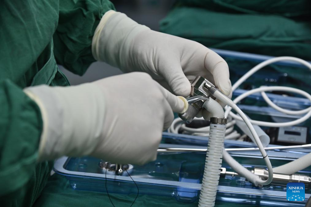 A medical worker connects artificial veins with the magnetically levitated biventricular assist device in Wuhan, central China's Hubei Province, March 30, 2025. (Photo by Zhao Jiong/Xinhua)
