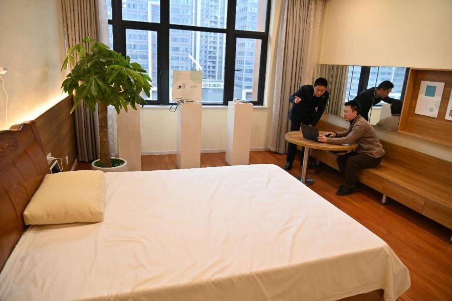In Shapingba district, southwest China's Chongqing municipality, technicians from a local company are testing and fine-tuning the software system of a smart, unobtrusive monitoring mattress designed for in-home elderly care. (People's Daily Online/Sun Kaifang)