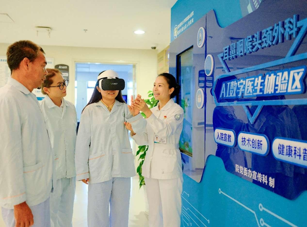 At Bishan Hospital of Chongqing Medical University, a medical staff member assists patients in experiencing a naked-eye 3D educational video featuring an AI-powered digital doctor. (People's Daily Online/Hu Yuejian)
