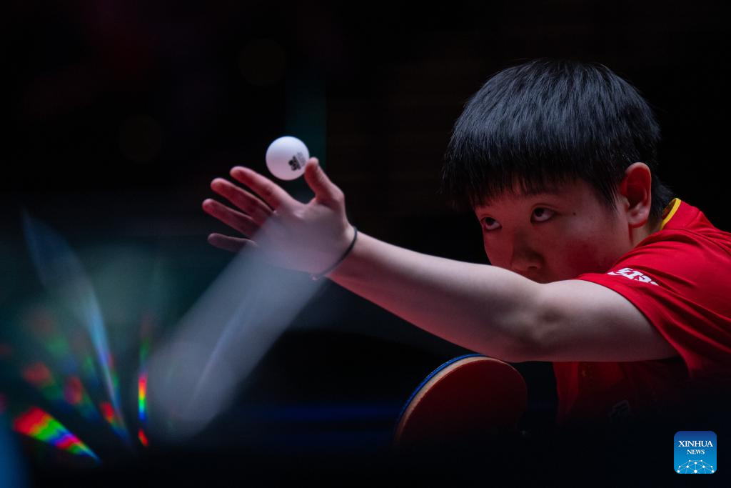 Sun Yingsha competes during the women's singles group match between Sun Yingsha of China and Zhang Mo of Canada at the ITTF Men's and Women's World Cup 2025 in Macao, China, April 15, 2025. (Xinhua/Cheong Kam Ka)