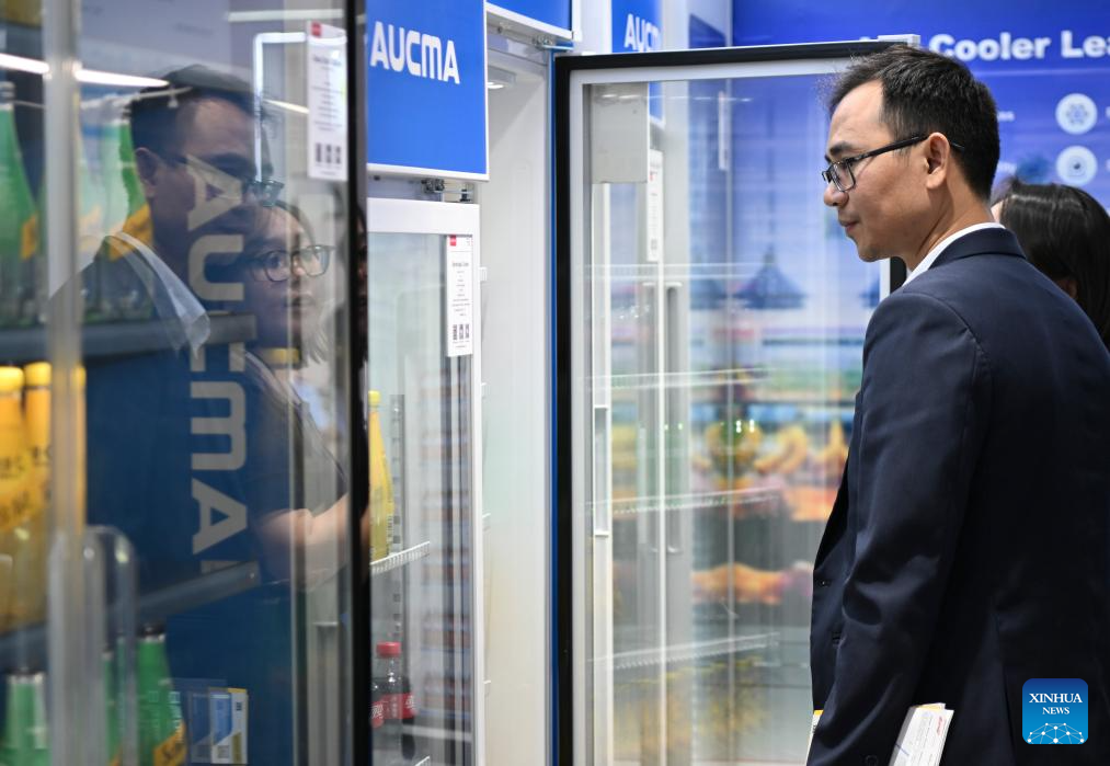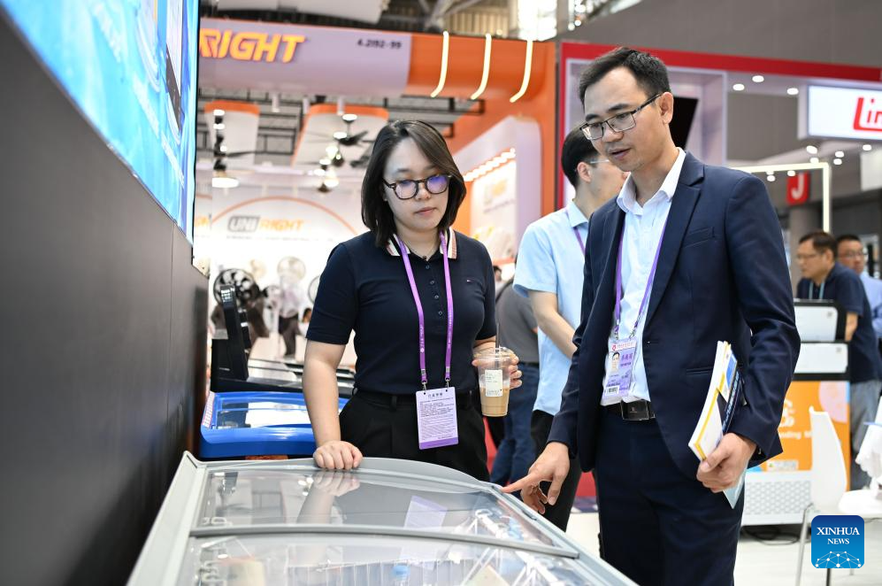 Huynh Ngoc Hoa (R) and his colleague view a refrigerator exhibited by a Chinese enterprise at the 137th edition of the China Import and Export Fair, also known as the Canton Fair, in Guangzhou, south China's Guangdong Province, April 15, 2025. (Xinhua/Deng Hua)