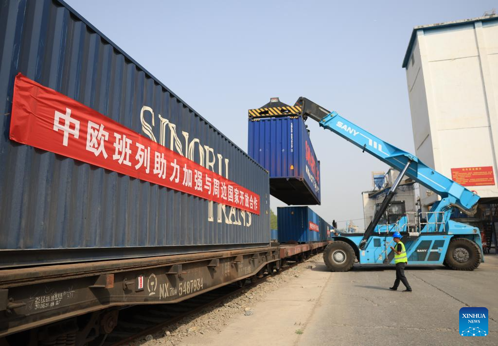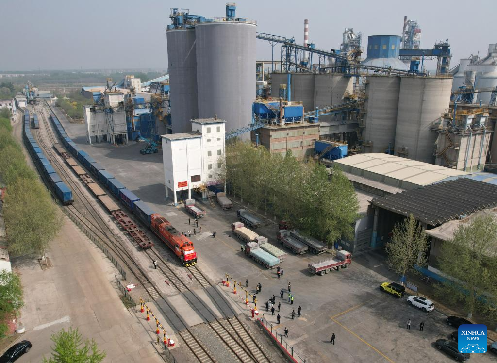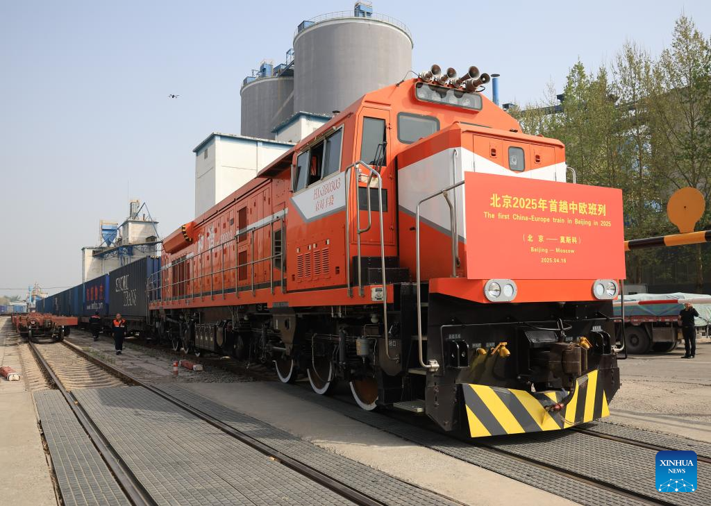 A China-Europe freight train bound for Moscow of Russia departs from a logistics center in Beijing, capital of China, April 16, 2025. Beijing on Wednesday sent its first China-Europe freight train in 2025. It is estimated that the train will cover a distance of about 9000 kilometers in 16 days. (Xinhua/Zhang Chenlin)