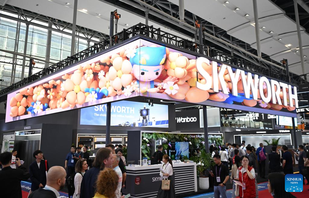 The booth of China's Skyworth Group is pictured at the exhibition zone of smart life products during the 137th edition of the China Import and Export Fair in Guangzhou, south China's Guangdong Province, April 15, 2025. The 137th edition of the China Import and Export Fair, also known as the Canton Fair, kicked off on Tuesday, with the number of export exhibitors exceeding 30,000 for the first time in the history of this famous event.