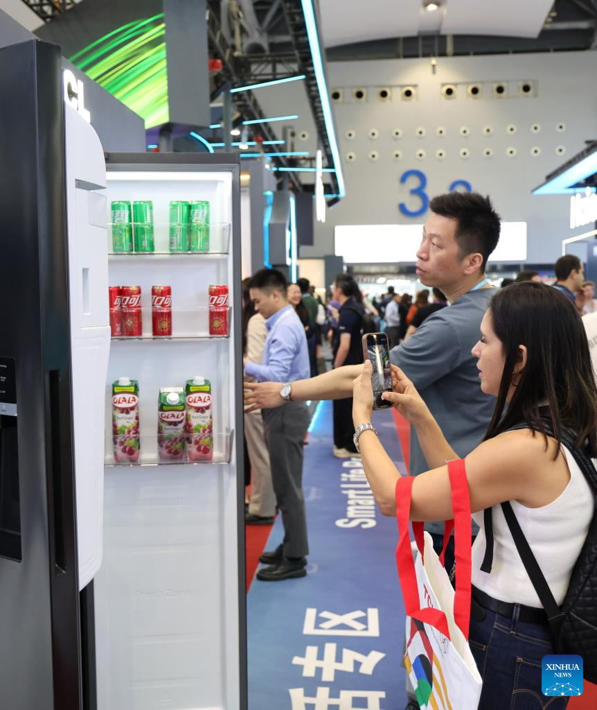 A buyer learns about an intelligent refrigerator during the 137th edition of the China Import and Export Fair in Guangzhou, south China's Guangdong Province, April 16, 2025. The 137th edition of the China Import and Export Fair, also known as the Canton Fair, kicked off on Tuesday, with the number of export exhibitors exceeding 30,000 for the first time in the history of this famous event.