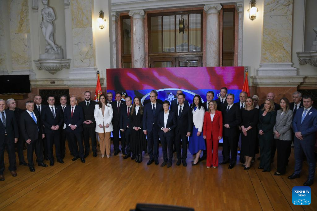 Serbia's new Prime Minister Djuro Macut and new cabinet members pose for a group photo after taking the oath of office at the Serbian Parliament building in Belgrade, Serbia, on April 16, 2025. (Photo by Predrag Milosavljevic/Xinhua)