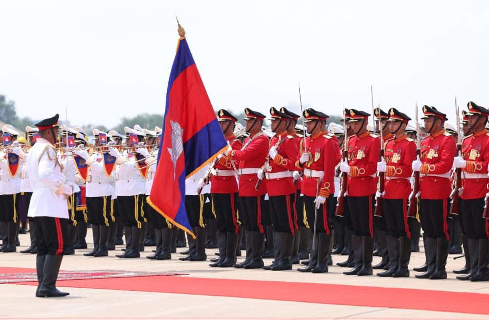 Members of an honor guard and a band line up at the airport in Phnom Penh, Cambodia, April 17, 2025. Chinese President Xi Jinping on Thursday arrived in Phnom Penh for a state visit to Cambodia at the invitation of Cambodian King Norodom Sihamoni. (Xinhua/Liu Weibing)