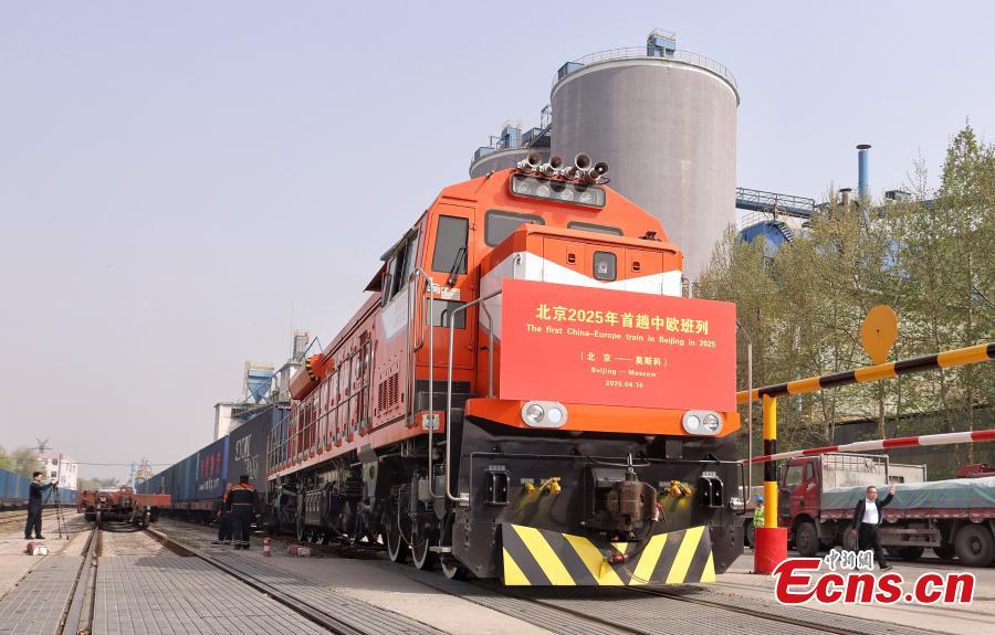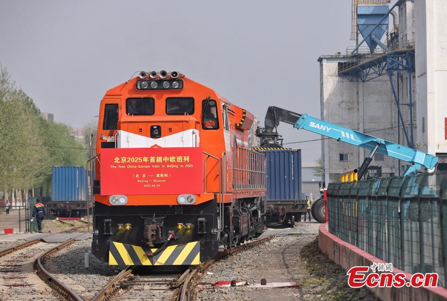 A China-Europe freight train bound for Moscow of Russia waits for departure at a logistics center in Beijing, April 16, 2025. (Photo: China News Service/Jia Tianyong)