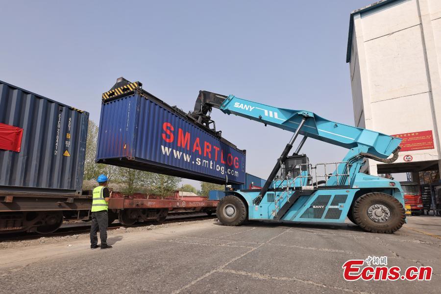 Containers are loaded on a China-Europe freight train bound for Moscow of Russia at a logistics center in Beijing, April 16, 2025. (Photo: China News Service/Jia Tianyong)