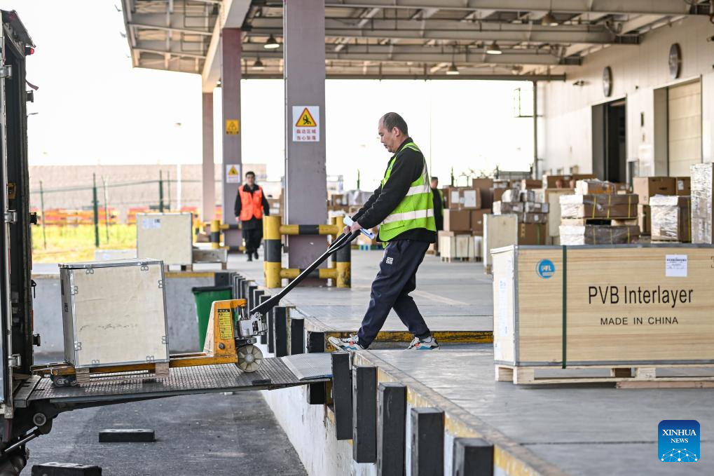 BEIJING, April 17 (Xinhua) -- A truck loaded with 1.3 tonnes of clothing, hats, sunglasses and other goods departed from the cross-border e-commerce warehouse at the comprehensive bonded zone of Beijing Daxing International Airport (BDIA), heading to the international cargo terminal of China Southern Air Logistics Co., Ltd. at the airport.