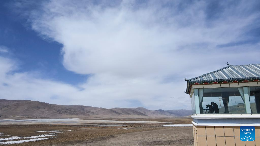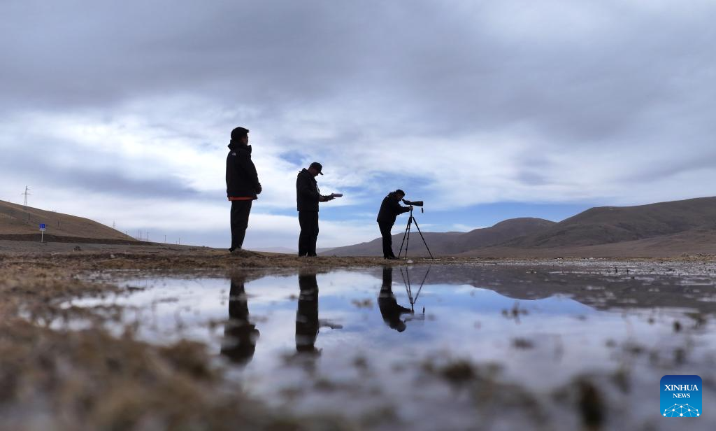 A drone photo taken on April 8, 2025 shows observers watching birds at the management station of Qinghai Longbao National Nature Reserve, located within Yushu City of Yushu Tibetan Autonomous Prefecture, northwest China's Qinghai Province. From a bird's eye view, the densely built houses of Yushu City nestle in mountain valleys, while the Batang River meanders through the city like a jade belt. The cityscape of Yushu presents a distinct sense compared to the traditionally perceived cold and arid highland cities. It resembles a city of water with the rich waterways of the Yangtze River source enveloping the main urban area in lush wetlands. (Xinhua/Qi Zhiyue)