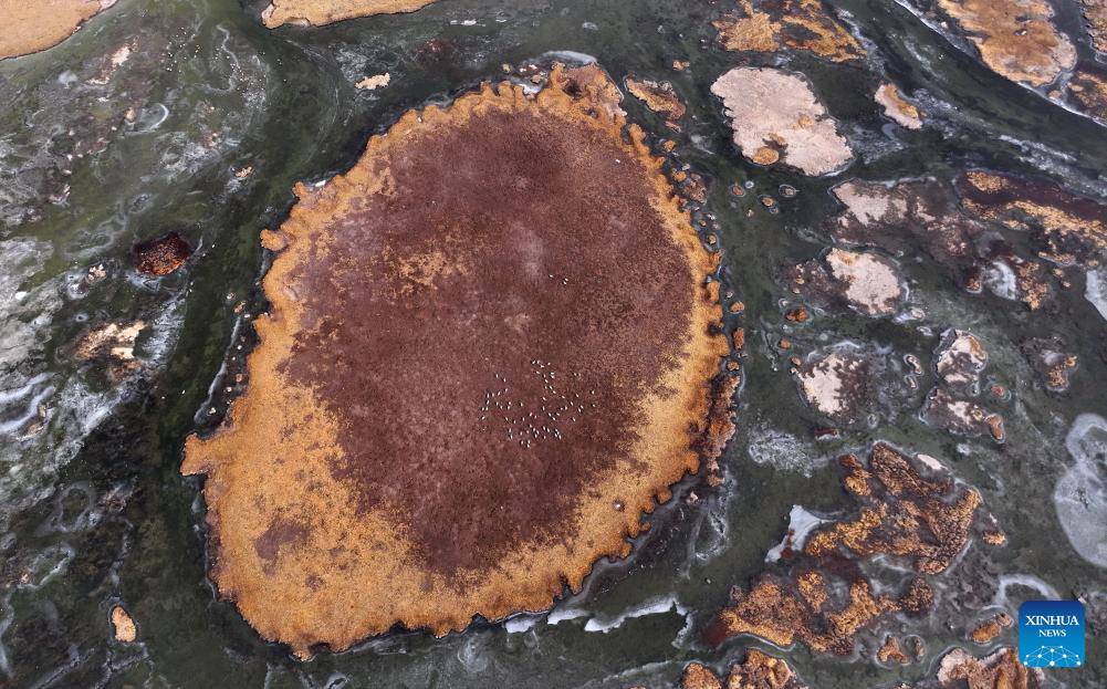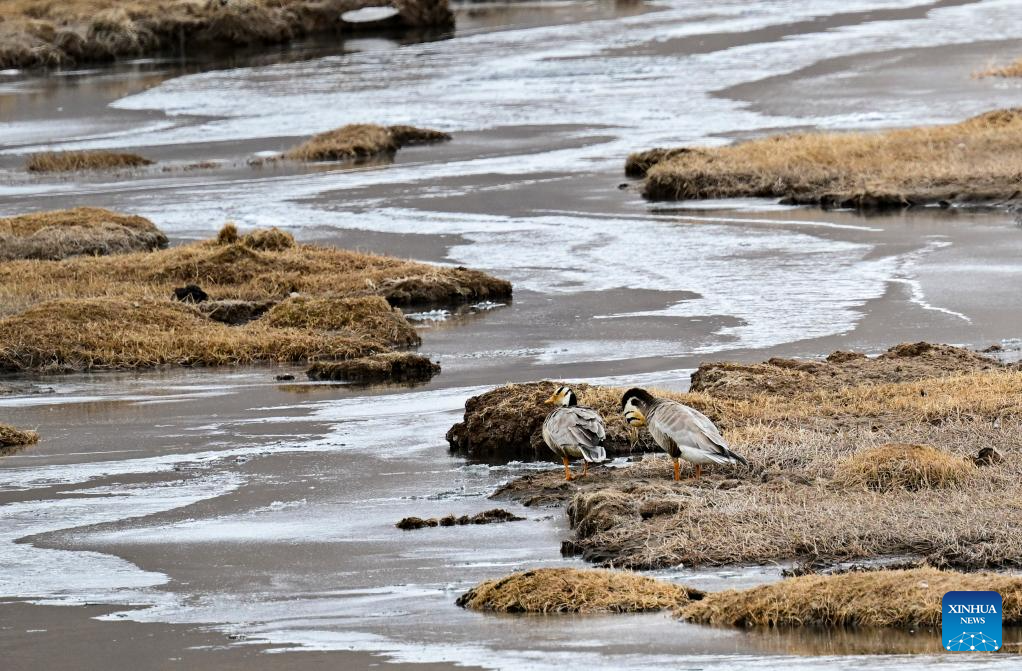This photo taken on April 8, 2025 shows bar-headed geese in Qinghai Longbao National Nature Reserve, located within Yushu City of Yushu Tibetan Autonomous Prefecture, northwest China's Qinghai Province. From a bird's eye view, the densely built houses of Yushu City nestle in mountain valleys, while the Batang River meanders through the city like a jade belt. The cityscape of Yushu presents a distinct sense compared to the traditionally perceived cold and arid highland cities. It resembles a city of water with the rich waterways of the Yangtze River source enveloping the main urban area in lush wetlands. (Xinhua/Zhang Long)