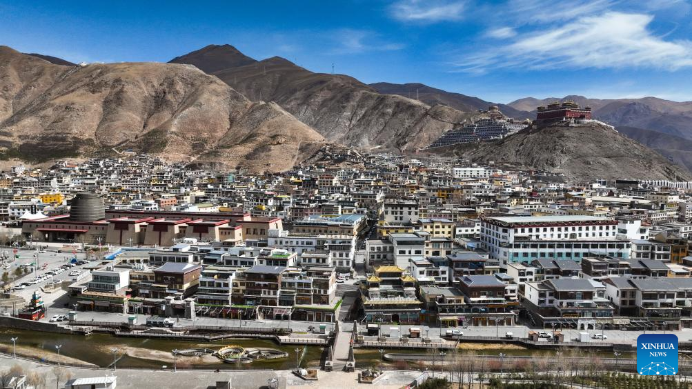 An aerial drone photo taken on April 10, 2025 shows the Gesar square in Yushu City of Yushu Tibetan Autonomous Prefecture, northwest China's Qinghai Province. From a bird's eye view, the densely built houses of Yushu City nestle in mountain valleys, while the Batang River meanders through the city like a jade belt. The cityscape of Yushu presents a distinct sense compared to the traditionally perceived cold and arid highland cities. It resembles a city of water with the rich waterways of the Yangtze River source enveloping the main urban area in lush wetlands. (Xinhua/Zhang Long)