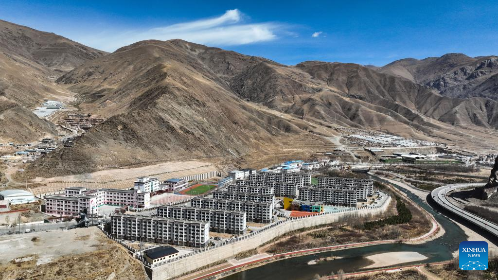An aerial drone photo taken on April 10, 2025 shows a residential area with the Batang River flowing alongside in Yushu City of Yushu Tibetan Autonomous Prefecture, northwest China's Qinghai Province. From a bird's eye view, the densely built houses of Yushu City nestle in mountain valleys, while the Batang River meanders through the city like a jade belt. The cityscape of Yushu presents a distinct sense compared to the traditionally perceived cold and arid highland cities. It resembles a city of water with the rich waterways of the Yangtze River source enveloping the main urban area in lush wetlands. (Xinhua/Zhang Long)