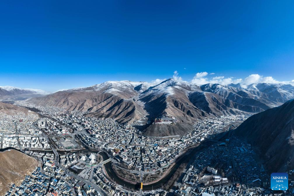 An aerial drone photo taken on April 6, 2025 shows a view of Yushu City of Yushu Tibetan Autonomous Prefecture, northwest China's Qinghai Province. From a bird's eye view, the densely built houses of Yushu City nestle in mountain valleys, while the Batang River meanders through the city like a jade belt. The cityscape of Yushu presents a distinct sense compared to the traditionally perceived cold and arid highland cities. It resembles a city of water with the rich waterways of the Yangtze River source enveloping the main urban area in lush wetlands. (Xinhua/Zhang Long)