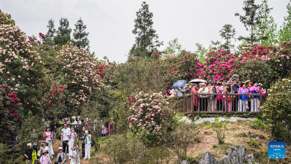Tourists enjoy the view of blooming azaleas at Baili Azalea Nature Reserve in Bijie City, southwest China's Guizhou Province, April 17, 2025. The blooming azaleas in Bijie attract many tourists in spring. (Xinhua/Tao Liang)