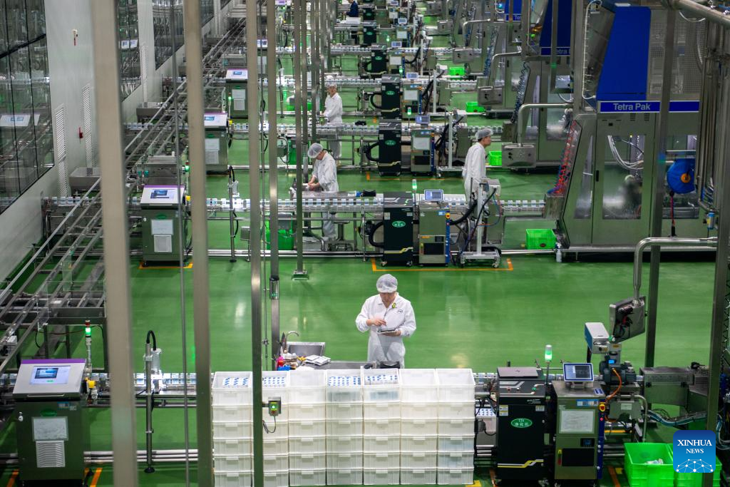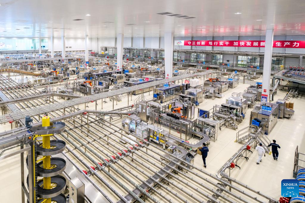 Staff members work in the filling workshop of the Global Intelligent Manufacturing Industrial Park of Yili Modern Intelligent Health Valley in Tumd Left Banner in Hohhot, north China's Inner Mongolia Autonomous Region, April 17, 2025. In recent years, Inner Mongolia Autonomous Region has given full play to its resource endowment and industrial advantages, and promoted the upgrading of the whole chain of dairy industry with scientific and technological innovation, advancing the quality development of dairy industry. (Photo by Li Xinyi/Xinhua)