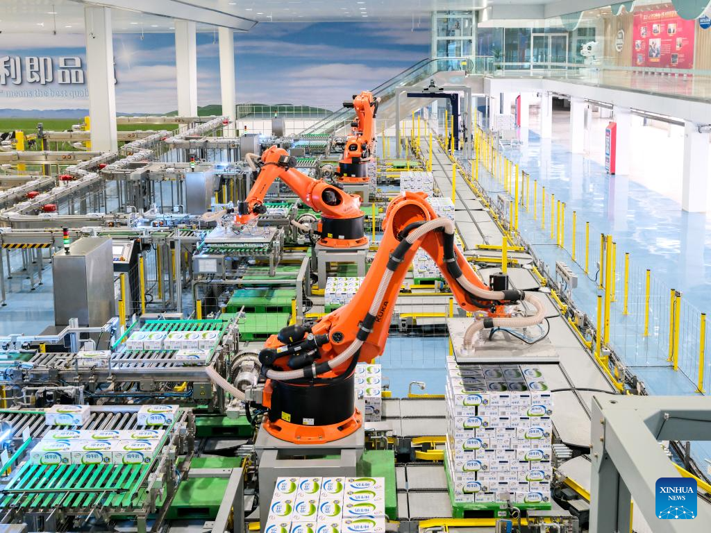 Robotic arms carry out packaging operation at the Global Intelligent Manufacturing Industrial Park of Yili Modern Intelligent Health Valley in Tumd Left Banner in Hohhot, north China's Inner Mongolia Autonomous Region, April 17, 2025. In recent years, Inner Mongolia Autonomous Region has given full play to its resource endowment and industrial advantages, and promoted the upgrading of the whole chain of dairy industry with scientific and technological innovation, advancing the quality development of dairy industry. (Xinhua/Ma Jinrui)