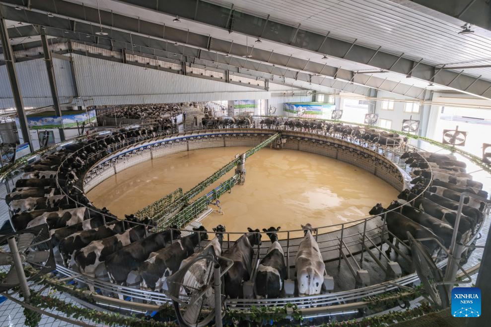 Cows are milked at Yili Chilechuan Ecological Intelligent Pasture in Tumd Left Banner in Hohhot, north China's Inner Mongolia Autonomous Region, April 17, 2025. In recent years, Inner Mongolia Autonomous Region has given full play to its resource endowment and industrial advantages, and promoted the upgrading of the whole chain of dairy industry with scientific and technological innovation, advancing the quality development of dairy industry. (Xinhua/Ma Jinrui)