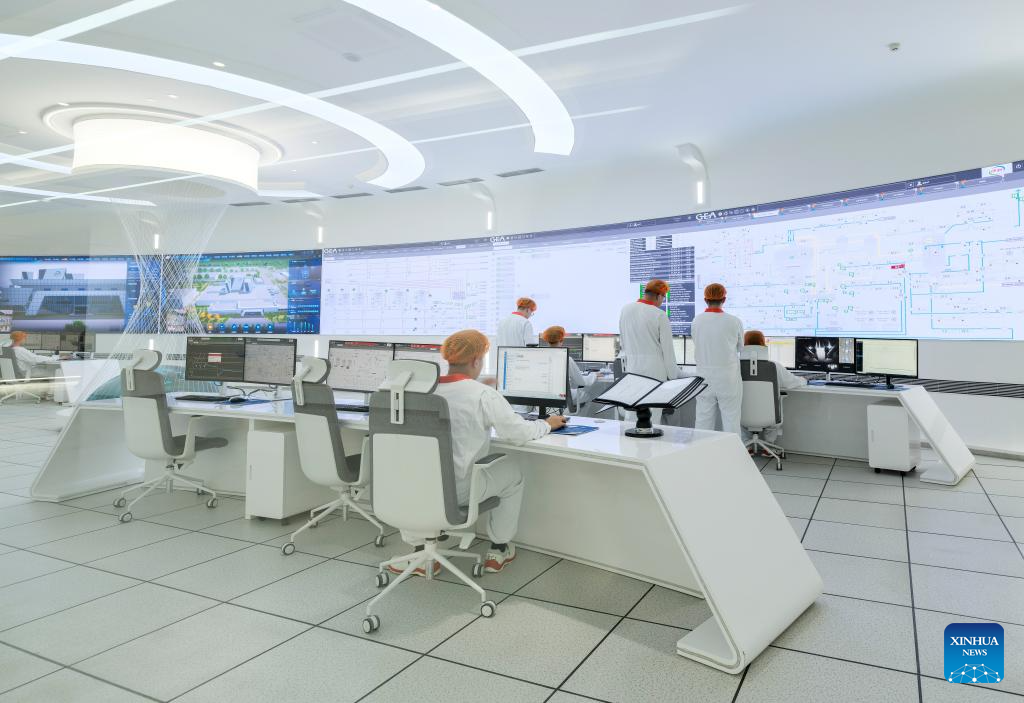 Staff members work in the intelligent control center of a global intelligent manufacturing benchmark base for milk powder at the Global Intelligent Manufacturing Industrial Park of Yili Modern Intelligent Health Valley, in Tumd Left Banner in Hohhot, north China's Inner Mongolia Autonomous Region, April 17, 2025. In recent years, Inner Mongolia Autonomous Region has given full play to its resource endowment and industrial advantages, and promoted the upgrading of the whole chain of dairy industry with scientific and technological innovation, advancing the quality development of dairy industry. (Xinhua/Ma Jinrui)