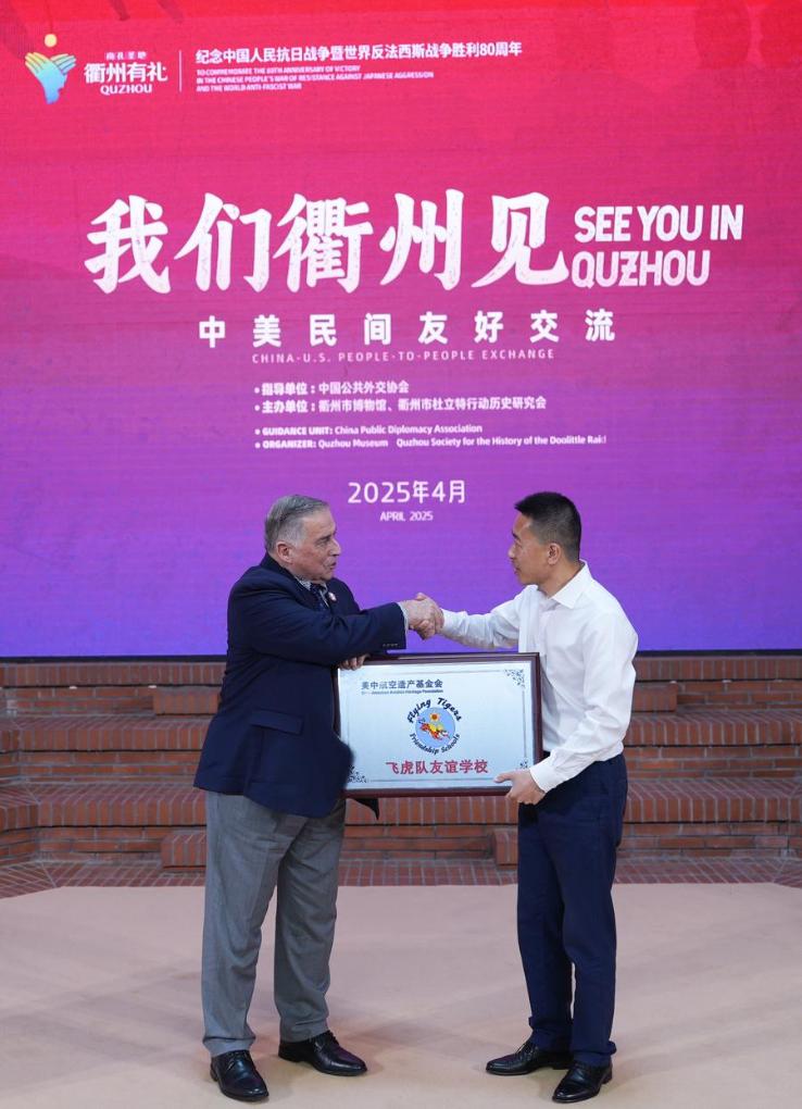 Chairman of the Sino-American Aviation Heritage Foundation Jeffrey Ballard (L) and a representative of Zhejiang Quzhou High School shake hands during a ceremony of establishing a partnership with the school in Quzhou City, east China's Zhejiang Province, April 18, 2025. The school becomes a participant of the program of the Flying Tigers Friendship School, which aims to enhance mutual understanding and friendship between young people in the two countries. (Xinhua/Huang Zongzhi)