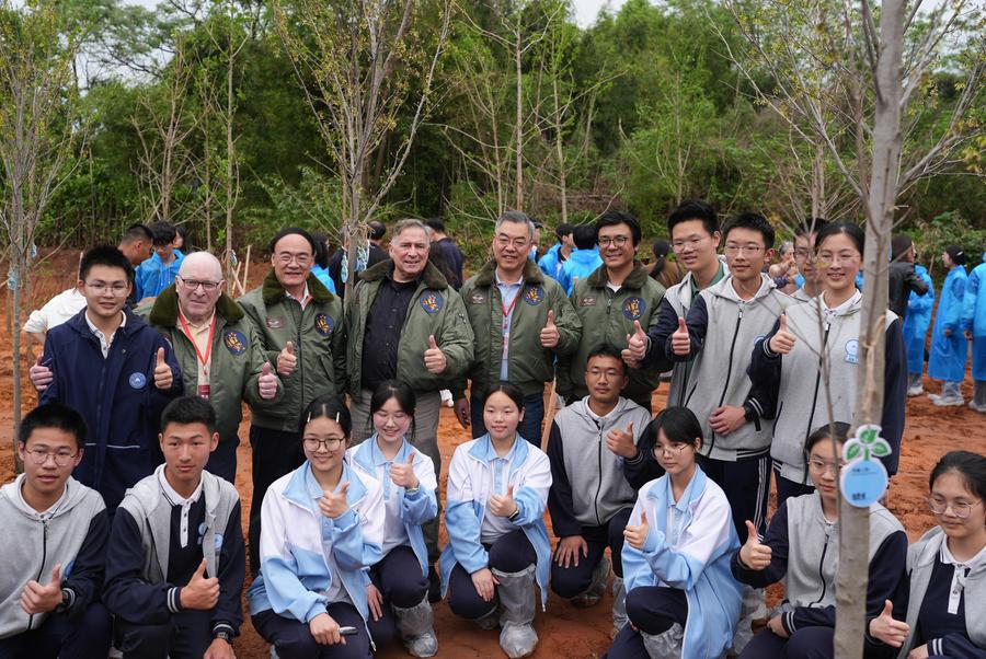 Guests and students pose for a group photo after planting trees in Quzhou City, east China's Zhejiang Province, April 17, 2025. (Xinhua/Huang Zongzhi)