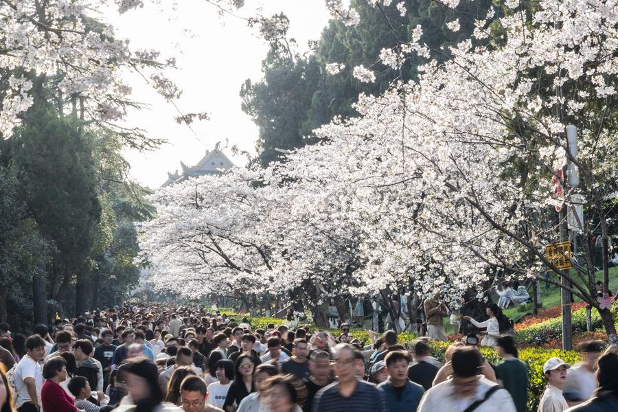 People enjoy cherry blossoms at Wuhan University in Wuhan, capital of central China's Hubei Province, March 22, 2025. (Xinhua/Wu Zhizun)