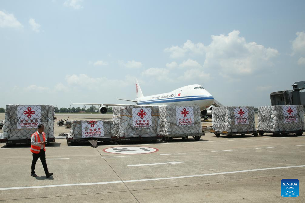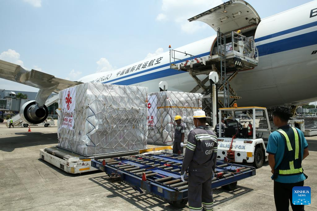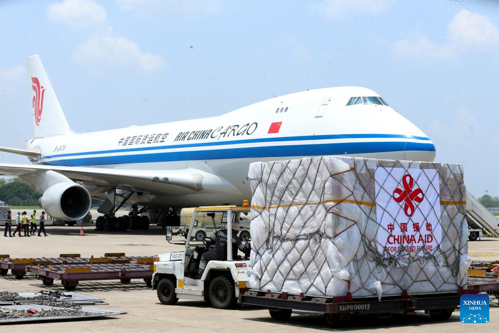 The seventh batch of emergency humanitarian aid supplies dispatched by the Chinese government arrives at Yangon International Airport in Myanmar on April 20, 2025. The aid supplies include 800,000 boxes of amoxicillin capsules, 122,000 bottles of paracetamol and mannitol injection, 225,000 boxes of cefradine capsules, and 480,000 bottles of ibuprofen tablets, with a total weight of 95 tons. (Xinhua/Myo Kyaw Soe)