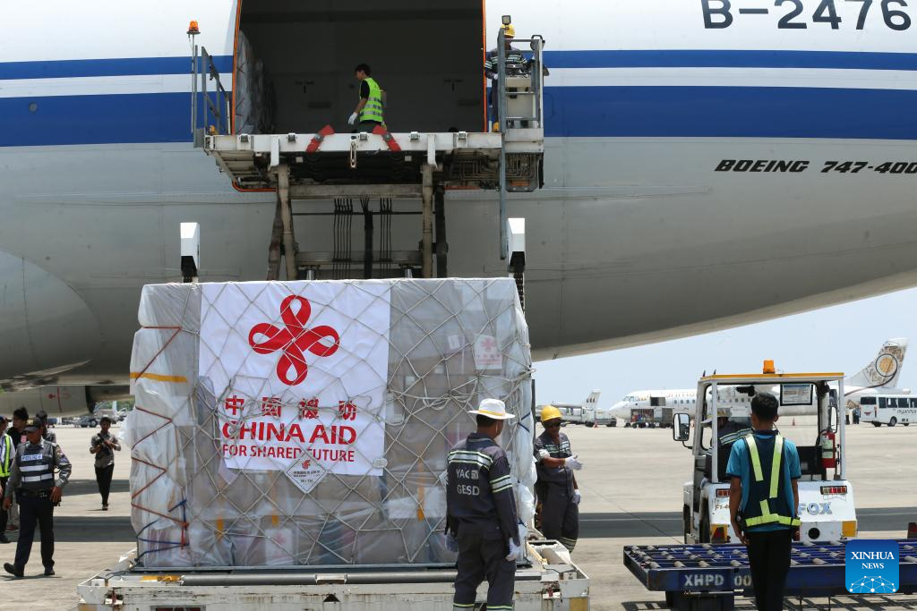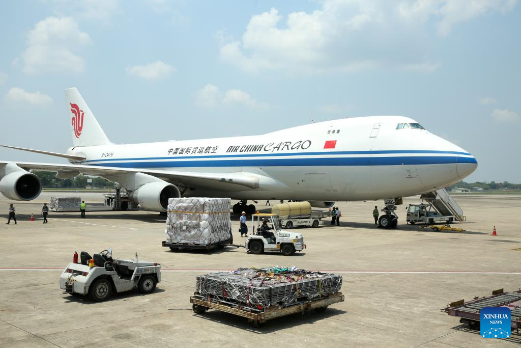 YANGON, April 20 (Xinhua) -- The seventh batch of emergency humanitarian aid supplies dispatched by the Chinese government on Sunday arrived at Yangon International Airport, Myanmar, which was hit by a devastating 7.9-magnitude earthquake on March 28.