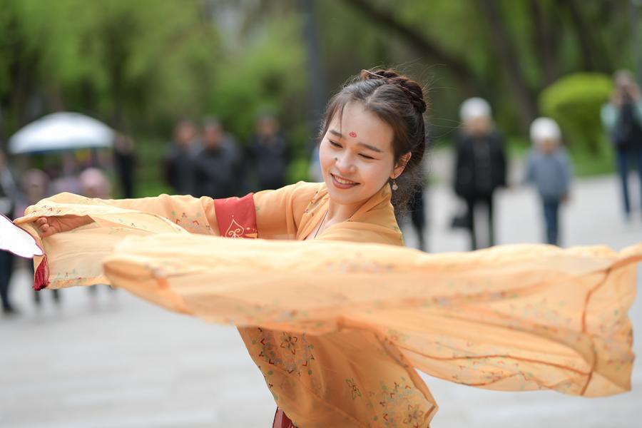 A woman in costume with Chinese elements dances at the 2025 International Chinese Language Day event in Almaty, Kazakhstan, April 19, 2025. (Xinhua/Li Renzi)