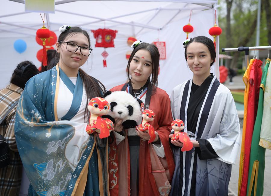 People in costumes with Chinese elements pose for photos at the 2025 International Chinese Language Day event in Almaty, Kazakhstan, April 19, 2025. (Xinhua/Li Renzi)